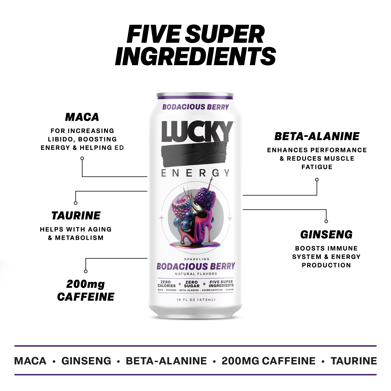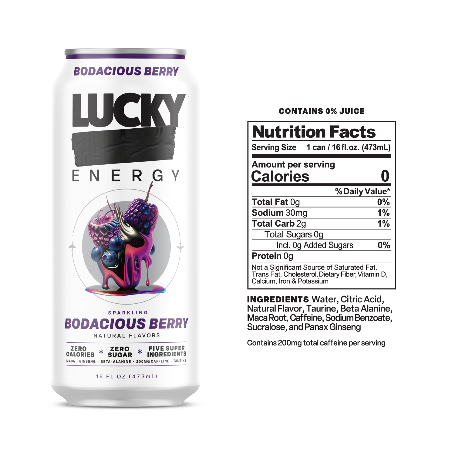 Forget flat berry waters and sad "fruit essence" fizz, Bodacious Berry is bold, juicy, and actually fun. And like every Lucky can, it's zero sugar, zero calories, and maxed out on clean energy.
